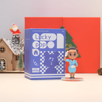 Figurine next to a 'Lucky Pop' box with Christmas decorations in the background